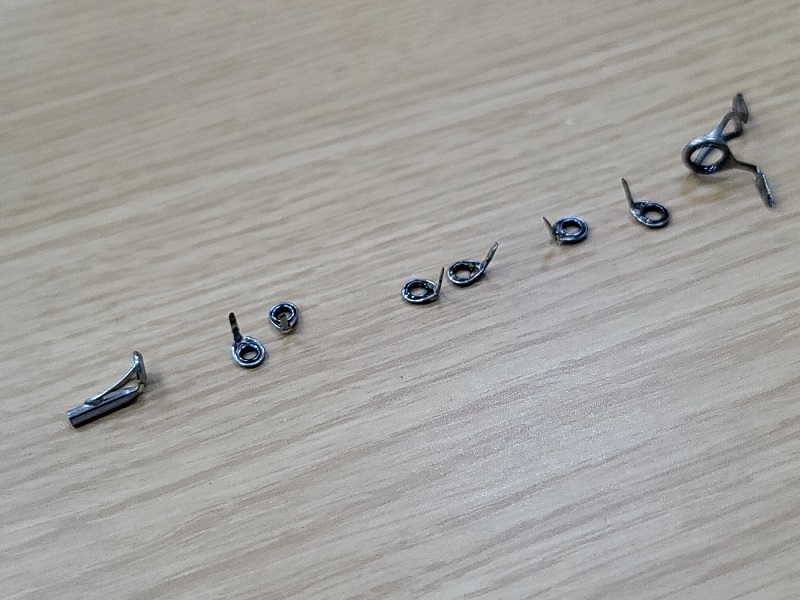 그동안 파손된 로드에서 따로 추출해서 모아둔 가이드로 조합을 해보니, 로드 한대 분량은 충분히 될 것 같다. 탑가이드 포함 8개의 가이드가 부족해 보일 수도 있겠지만, 6피트 미만의 로드에 스파이럴 가이드 배열을 예정하고 있기 때문에 모자라지는 않을 것 같다. 사이즈를 맞추다보니, 어쩔 수 없이 SIC링 가이드와 토르자이트링 가이드를 섞어서 사용할 수 밖에 없는 점은 좀 아쉽다. 그래도 요즘 많이 유행하고 있는 RV가이드를 버트 가이드로 사용할 수 있어서 다행이다.