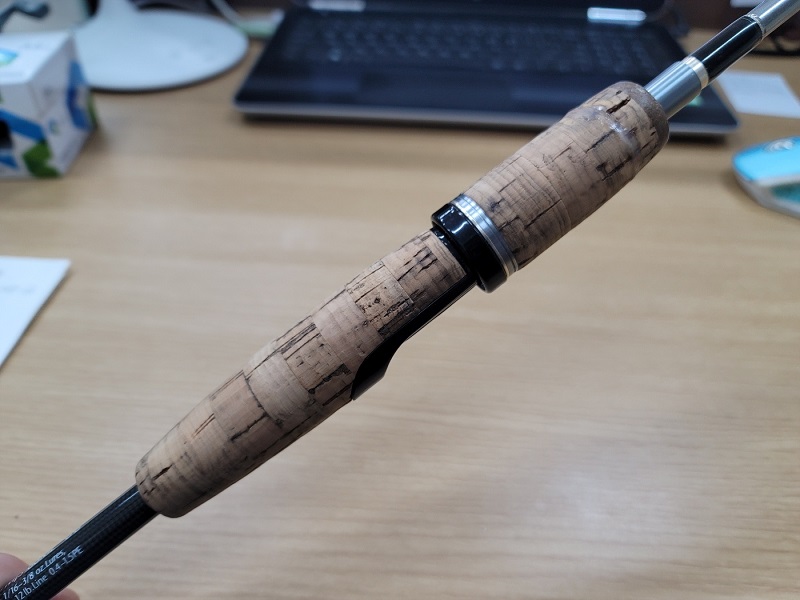 로드는 에버그린 테무진 브러시 스팅거입니다. 요 녀석도 이제는 연식이 꽤되는 편이라 디자인이 참 깔끔하면서도 구수합니다. 그 당시 에버그린 스피닝 로드들이 다운락 방식의 포어그립 후드을 채용하는 경우가 많았는데, 오래 사용하거나 무리하게 조이게 되면 콜크부분이 파손되는 경우가 많았습니다. 지인도 파손된 포어그립을 본딩해서 사용하다가 이번에 튜닝을 의회한 것입니다.