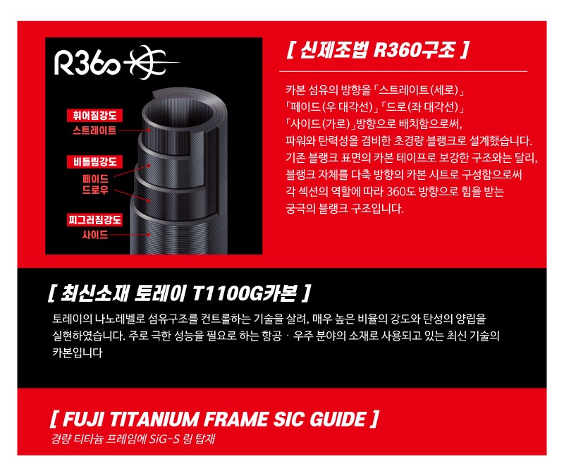 일단 눈에 띄는 부분은 블랭크의 소재와 제작공법이다. 메이저크래프트사는 아지도, 에기조스트 등 바다루어로드부터 토레이 T1100G카본을 쓰기 시작했는데, 이번에 배스로드시리즈인 데이즈360에도 채용이 되었다. 그리고 R360이라는 신제조법은 내 기억으로 처음 쓰는 공법인 듯 한데, 요 부분은 직접 사용해봐야 판단을 내릴 수 있을 것 같다.