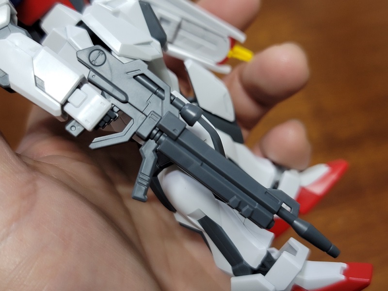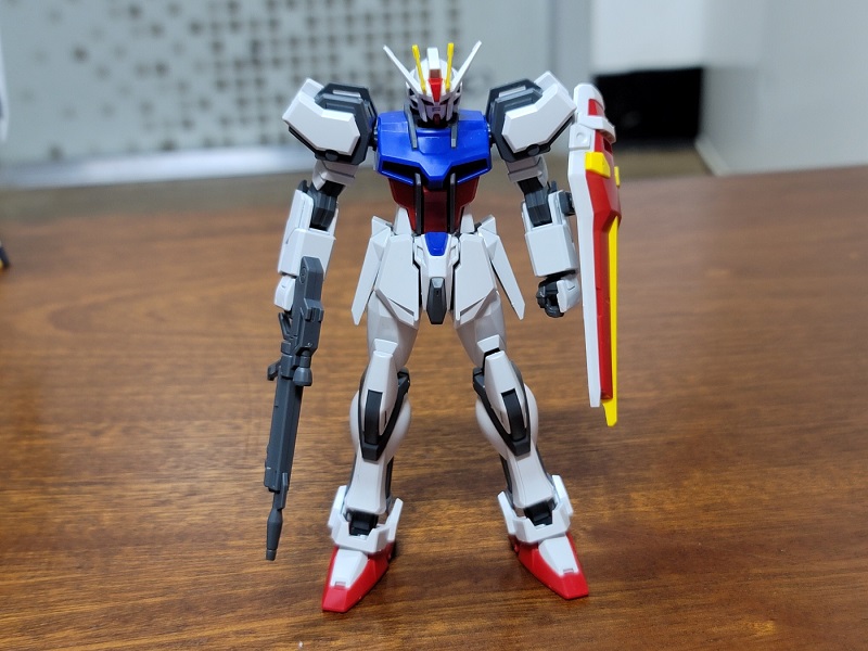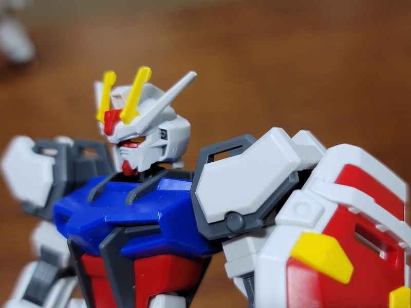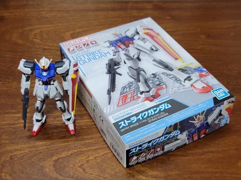 아이러니하게도 스트라이크 건담 중 EG가 가장 최신의 건프라이다. 1/144 스케일이라 HG나 RG랑 많은 대비를 이루는 듯 하다. HG는 한 등급 위 건프라지만, 이미 EG가 조형이나 디테일에서 앞선다. 그리고 RG는 엄청난 디테일과 조립감을 안겨주지만, 비율적인 측면에서 이미 구형 건프라가 되어버렸다. 그리고 관절의 강도도 EG가 HG, RG보다 더 탄탄한 느낌을 준다. 다만 EG 스트라이크 건담은 에일팩과 같은 스트라이커 팩이 부속되지있지않고, 다양한 무장 중 빔 라이플과 실드만 부속되어 있는 것도 좀 아쉬운 편이다. 그리고 발바닥부분의 골다공증도 조금 아쉽다. 엔트리 등급인데다가 단가절감 측면이라 사료된다.