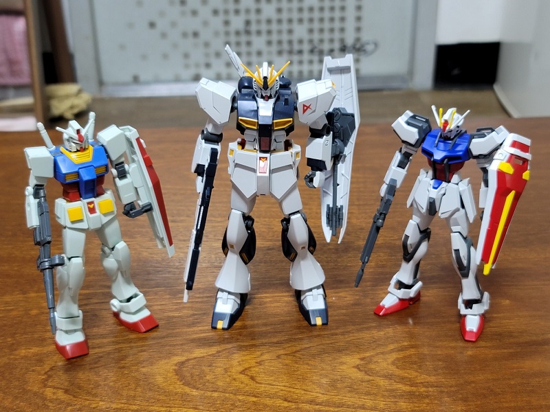 EG 건담은 현재까지 3탄까지 출시되어있다. 1탄 퍼스트 건담, 2탄 스트라이크 건담, 3탄 뉴건담..