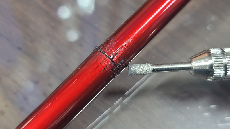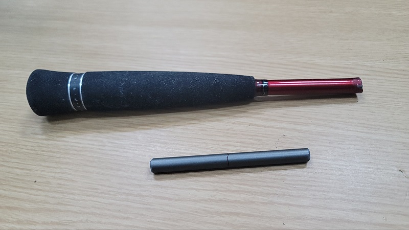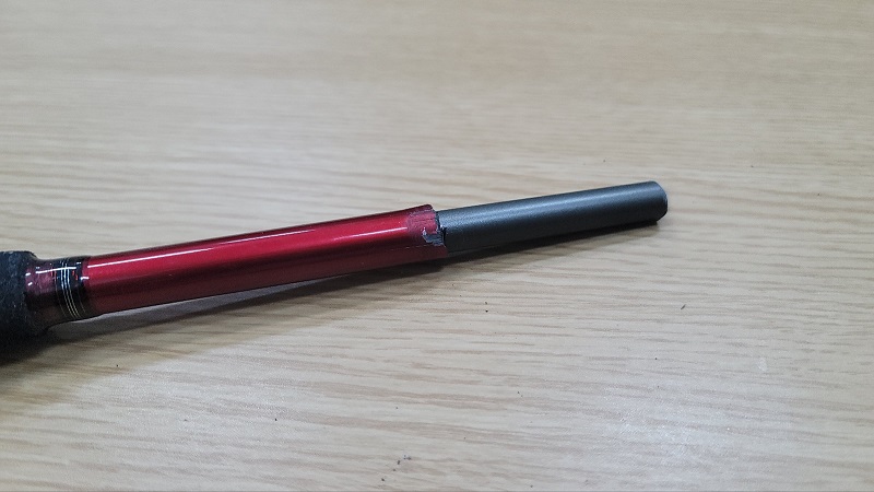 1) 먼저 리어 그립 뒷마개 부분을 전동드릴을 이용해서 블랭크 내경사이즈의 구멍을 뚫어준다.. 이는 대부분의 블랭크는 위로 갈수록 좁아지는 테이퍼구조로 되어있기 때문에 넓은 쪽에서 조인트(스피갓)을 삽입해야만 한다. 이번 작업에 사용한 조인트(스피갓)도 테이퍼구조로 되어있기에 당연한 내용이다. 조인트(스피갓)는 수리할 로드보다 더 튼튼하고 강한 브랭크를 이용해서 컷팅해 가면서 공차를 줄여가는 게 중요하다.