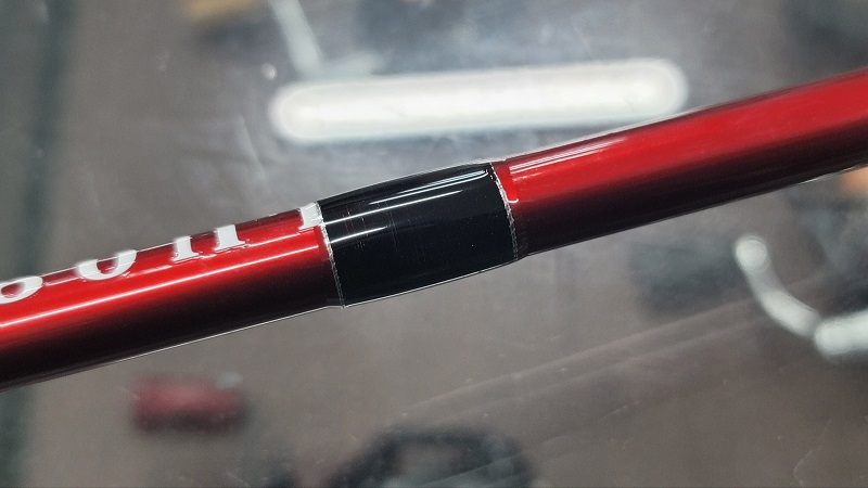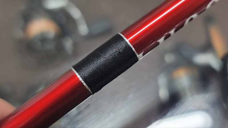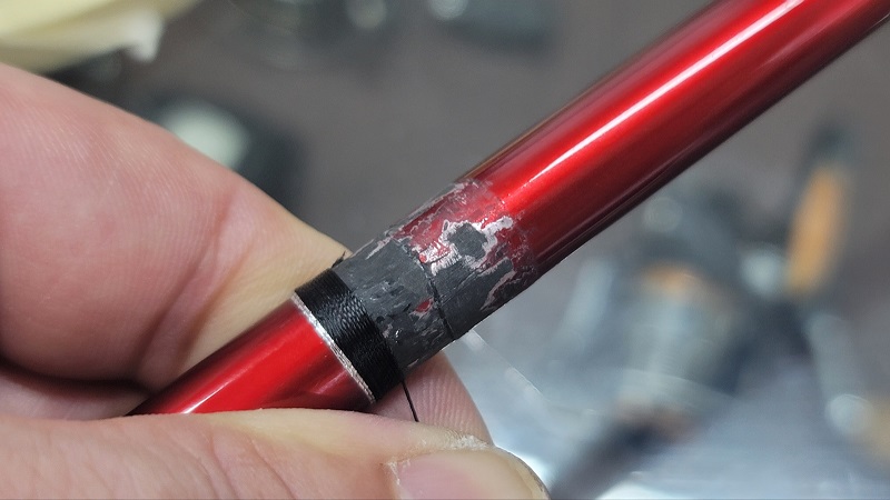 6) 랩핑사를 이용해서 조인트부분을 단단히 감아준다. 미적인 부분도 있지만, 대부분의 카본블랭크 단면은 힘을 받으면, 결대로 갈라지는 경향이 있기 때문에 이를 예방하기 위함이다.. 에폭시를 바르고 건조기에 돌리면 작업완료..