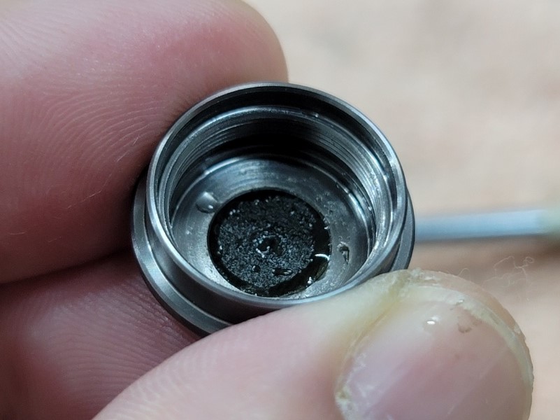 메커니컬캡, 요즘은 어드저스터라고 불리는 부분을 분해하니 물이 흥건하게 고여있는 것이 아닌가? 오일이 아닌가 의심도 해보았지만, 자세히 관찰하니 확실하게 수분이었습니다. 그러니 아무리 좋은 베어링이라도 버텨내지를 못하는 것입니다. 최근 몇년간 시마노에서 출시된 고급 베이트릴들의 공통적인 문제점이기도 합니다. 특히 메커니컬 브레이크 외부에 없는 16 안타레스 DC는 그 정점을 찍은 모델이었습니다. 7만엔 중반 가격의 릴들이 이런 고질병을 가지고 있으니, 유저들에게 측은지심이 드네요..