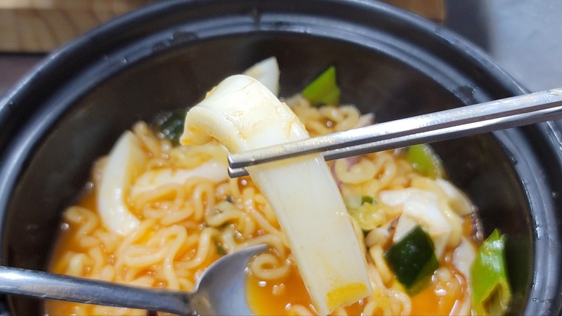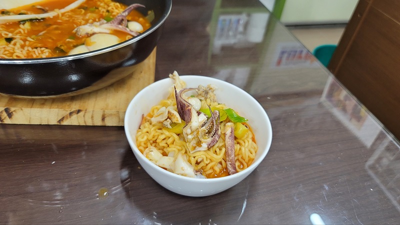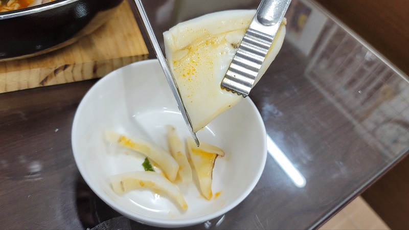 개인의 기호에 맞게 면의 익은 정도를 결정하고, 가위로 무늬오징어를 슝슝 썰어서 그릇에 담고 면과 국물을 올려주면 ok!!!