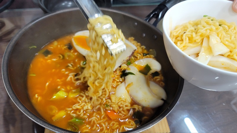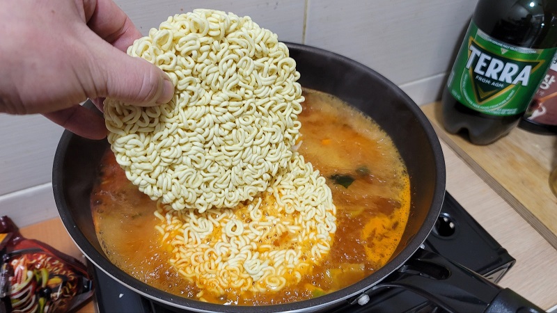 냄비에 물을 올리고 머리와 다리부분을 미리 넣어 육수를 만들어준다. 육수가 끓으면 면과 스프를 넣고 가열차게 끓여준다.