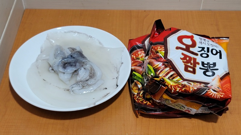 금일은 지인과 함께 먹기 위해 농심 오징어 짬뽕을 두개 준비했다. 그리고 고구마급의 무늬오징어를 미리 손질해서 준비해 두었다.